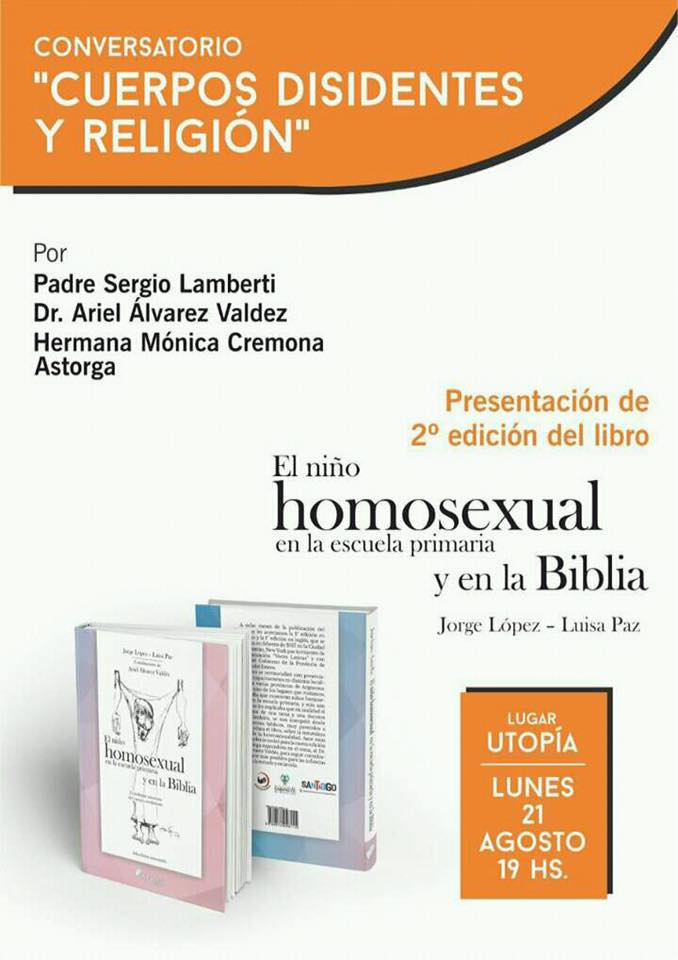Entonces acá va el libro que iba a ser presentado anteayer (se suspendió hasta nuevo aviso) en Santiago del Estero: “El niño homosexual en la escuela primaria y en la Biblia”, una joyita para contrarrestar a tantas señoritas Prim que andan dando vueltas por ahí.